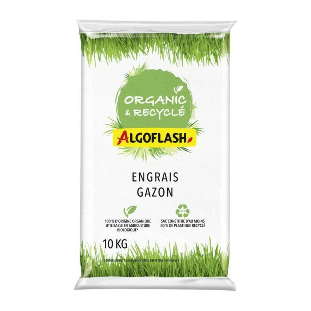 ??engrais organique complet adapté au gazon. Fertilise et participe a la bonne croissance du gazon. Emballage composé a 80 % de plastique recyclé. Composé de sous-produits d’industrie dont des résidus de coques de cacao. Label produit naturel. Utilisable en agriculture biologique*.