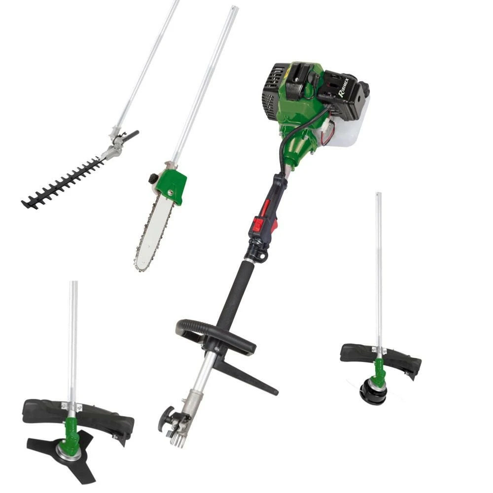 Système de refroidissement par air. Rapport de compression 9 : 1.Réservoir essence 1200 ml. Démarrage manuel par cordon.Poignée de commande sur manche moteur. Longueur totale du manche 1,50 m (manche moteur + manche outil).• Taille-haies : lame 395 mm. Tête articulée avec verrouillage 13 positions (270°). Coupe de branche max Ø 24 mm. 2 fourreaux de protection de la lame.• Élagueuse : Vitesse maxi de la chaîne : 16 m/sec. Lubrification automatique de la chaîne. Réservoir huile de chaîne 150 ml. Guide-chaîne, chaîne et fourreau de protection. • Débroussailleuse : lame métal 3 dents double affûtage. Carter de protection en polypropylène. • Coupe-bordures : se fixe à la place de la tête de débroussailleuse. 2 fils nylon 2,5m de Ø 2,4 mm. Avance semi-automatique du fil. Carter de protection de la débroussailleuse. Livré avec une sangle de maintien réglable avec épaulette, 1 bidon de mélange 600 ml, 1 clé à bougie multifonctions, 2 clés Allen, 1 clé plate, 1 tournevis à lame réversible