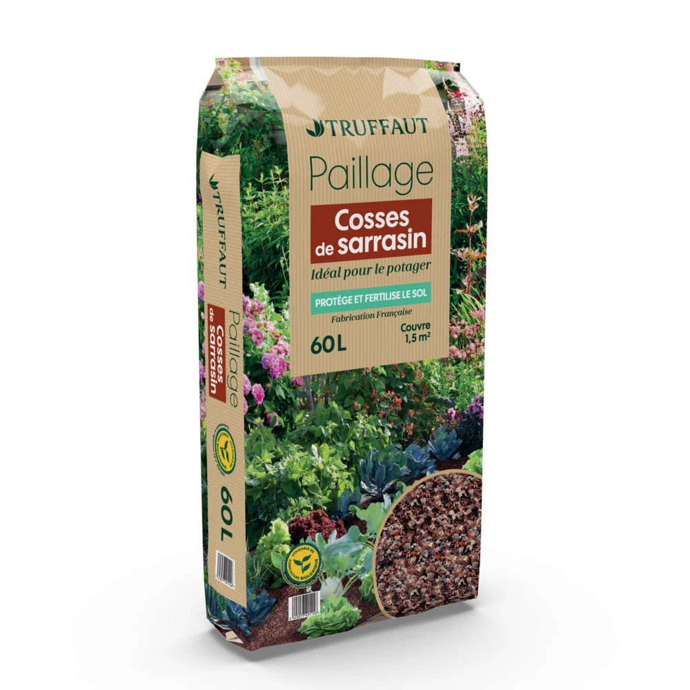 Les cosses de sarrasin constituent un excellent protecteur des cultures, il fait barrière aux limaces et escargots. Une fois humide, il peut retenir la moitié de son poids en eau, ce qui permet de limiter les arrosages. D’une durée de vie de 6 mois à 1 an, il se décompose rapidement. Il peut être ainsi incorporé à la terre en fin de culture, pour la regénérer en matière organique et ainsi obtenir de meilleurs rendements lors des prochaines plantations. Il est particulièrement recommandé au potager ou au verger, mais également au pied des fleurs vivaces et annuelles.